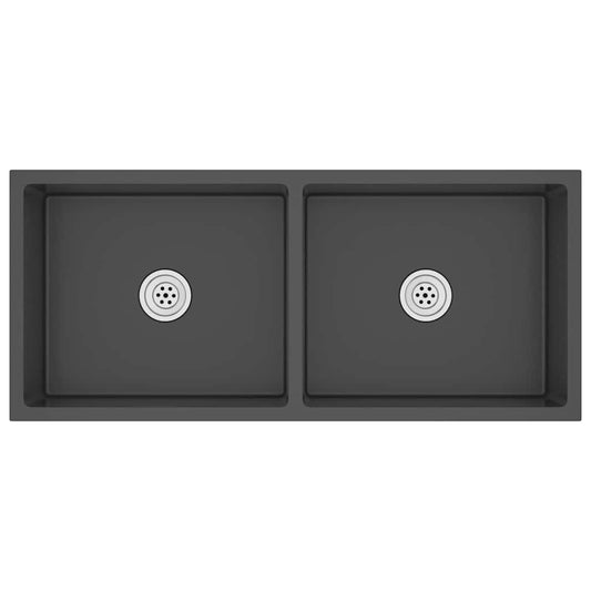 Double Kitchen Sink with Overflow Hole in Gray Granite
