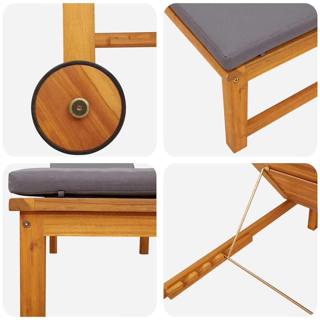 - Materiali: Fatto in legno massello di acacia, questo lettino prendisole ti offre un posto solido dove sederti. L'acacia è resistente e si adatta perfettamente all'esterno, rendendolo ideale per mobili da giardino. Oltre a renderlo robusto, aggiunge anche un tocco naturale al tuo spazio. La venatura del legno è stupenda, perfetta per il contesto esterno.