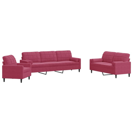 Set di Divani 3 pz con Cuscini e Rinforzi Rosso Vino in Velluto