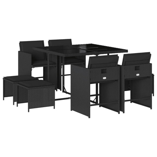 Set da Pranzo da Giardino 9 pz con Cuscini Nero in Polyrattan