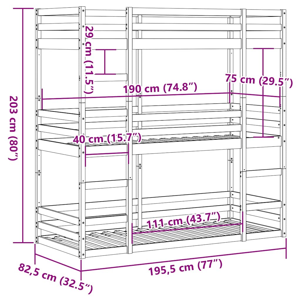 Letto Castello Triplo Marrone Cera 75x190cm Legno Massello Pino