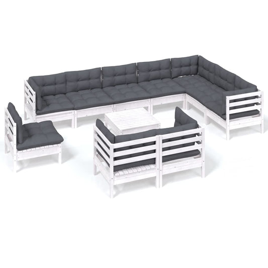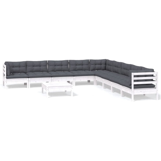 Set Divani da Giardino 11 pz con Cuscini Bianchi Legno di Pino