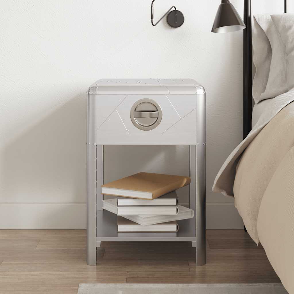 Questo tavolino in stile aviatore è realizzato in legno massello e la sua superficie è rivestita con un mosaico di pannelli in alluminio lucidato, accentati con viti in acciaio a vista, che lo rendono estremamente resistente. I bordi lisci e la maniglia del cassetto retrò conferiscono al tavolino aviatore un aspetto unico.